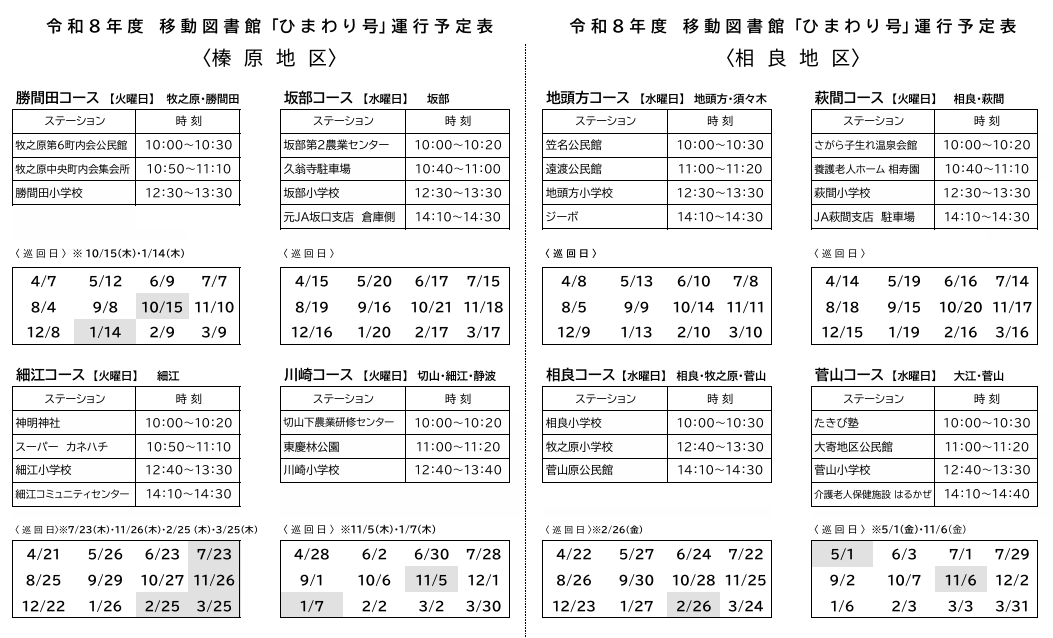 令和8年度移動図書館ひまわり号運行表